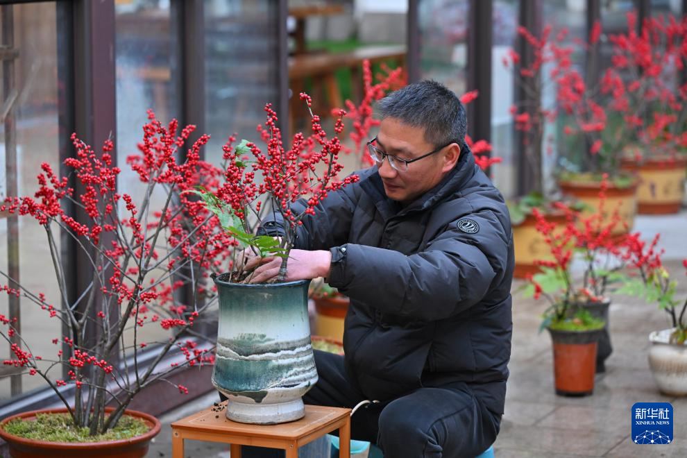 1月14日,位于福建省周宁县浦源镇的田园农业开发有限公司,企业负责人在整理冬青盆栽。