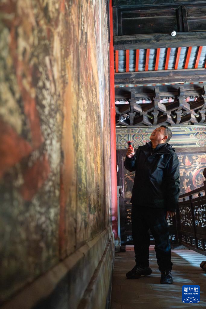 1月15日,杨志坚在白沙壁画博物馆查看大宝积宫壁画。