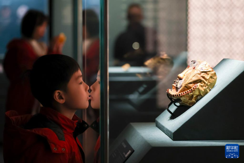 1月20日,观众在展览上观看公元4至5世纪的镶嵌红宝石金面具。