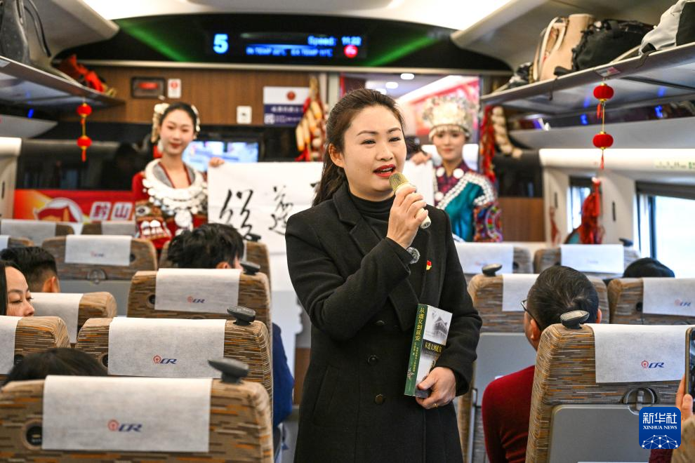 1月26日,宣讲员在遵义开往延安方向的G3360次列车上给旅客讲红色故事。
