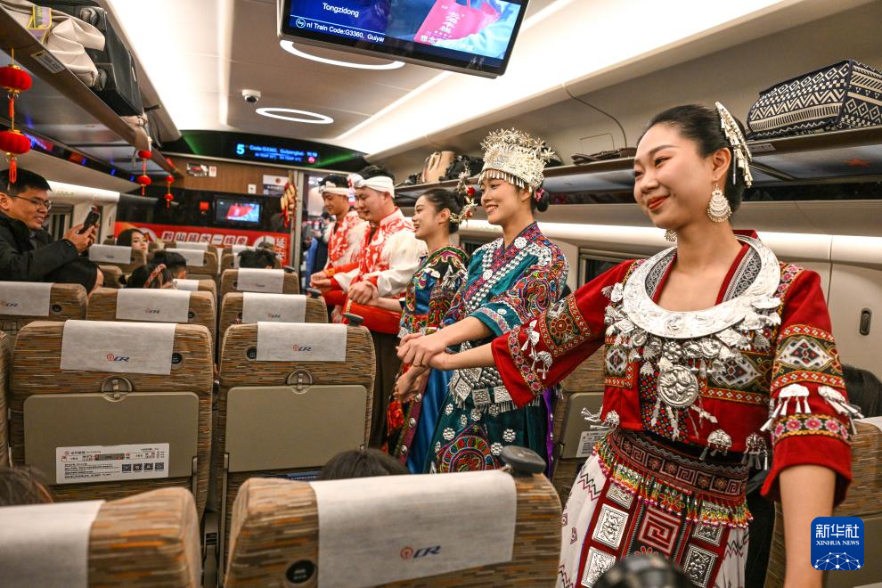 1月26日,青年志愿者在遵义开往延安方向的G3360次列车上给旅客表演节目。