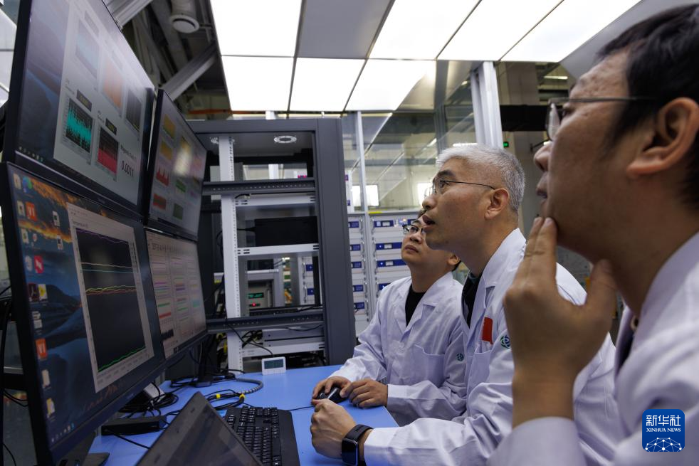 1月26日,实验站负责人、副研究员李岗,中国科学院电工研究所研究员刘建华、中国科学院电工研究所博士后周本哲(从左至右)在位于北京怀柔的中国科学院物理研究所综合极端条件实验装置极低温强磁场量子振荡实验站讨论全超导用户磁体的运行情况。