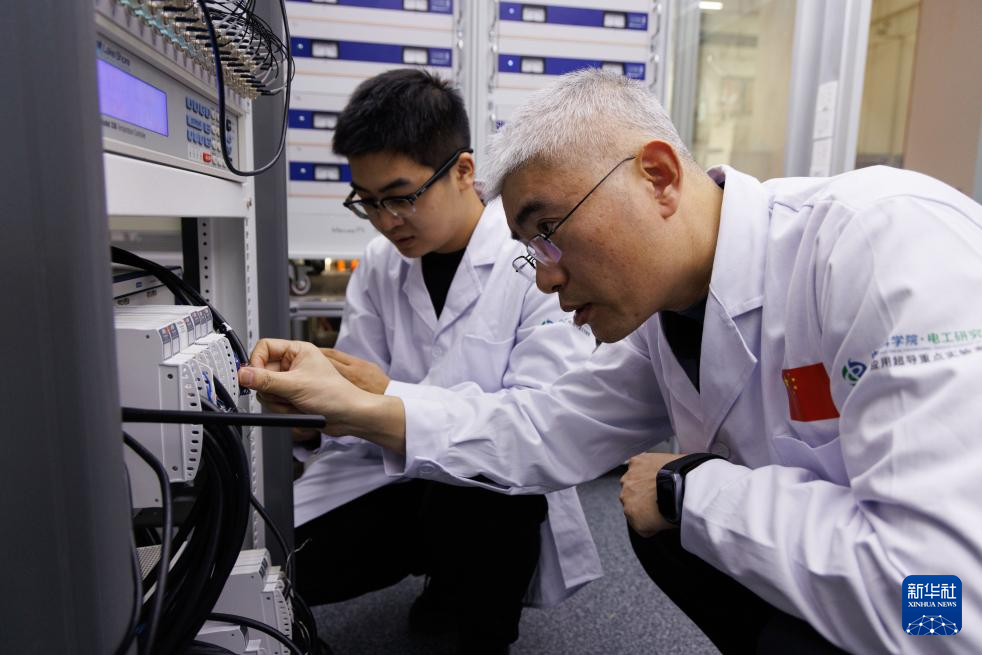 1月26日,在位于北京怀柔的中国科学院物理研究所综合极端条件实验装置极低温强磁场量子振荡实验站,中国科学院电工研究所研究员刘建华(右)、中国科学院电工研究所博士后周本哲在工作中。