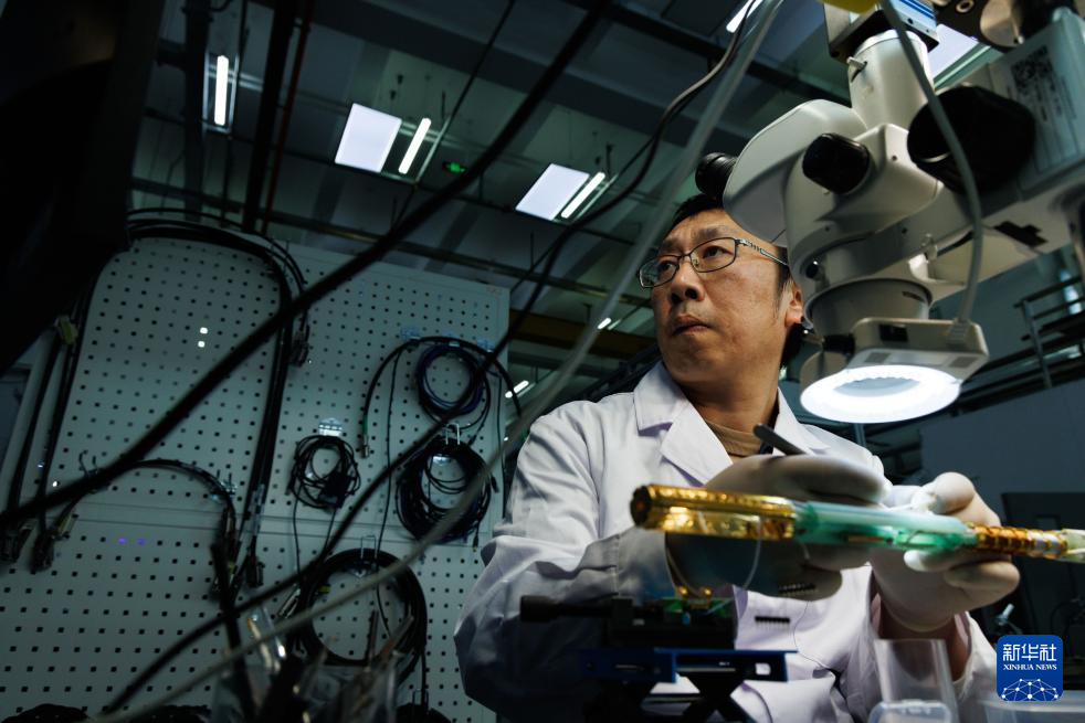 1月26日,在位于北京怀柔的中国科学院物理研究所综合极端条件实验装置极低温强磁场量子振荡实验站,科研人员准备实验测量杆。