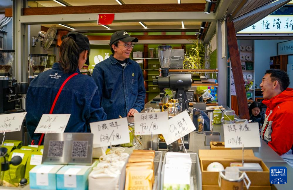 1月27日,在昆明大观篆新农贸市场的一家咖啡店里,咖啡师(左二)和游客交流咖啡文化。