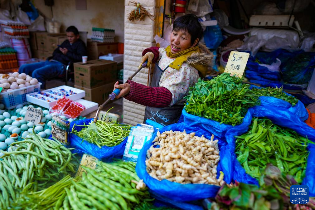 1月27日,在昆明大观篆新农贸市场,摊主在整理蔬菜。