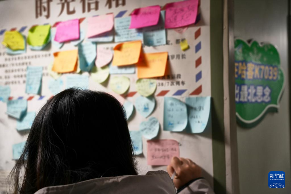 1月26日晚,在哈尔滨开往漠河的“雪国列车”上,游客在时光信箱上写下愿望。
