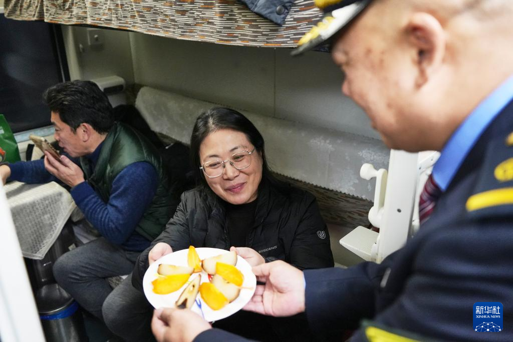 1月26日晚,在哈尔滨开往漠河的“雪国列车”上,乘务员为游客递上特色果盘。
