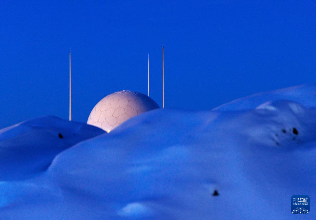 1月25日,工作人员李强(左)和田冬在一起清除天线罩顶上积雪。