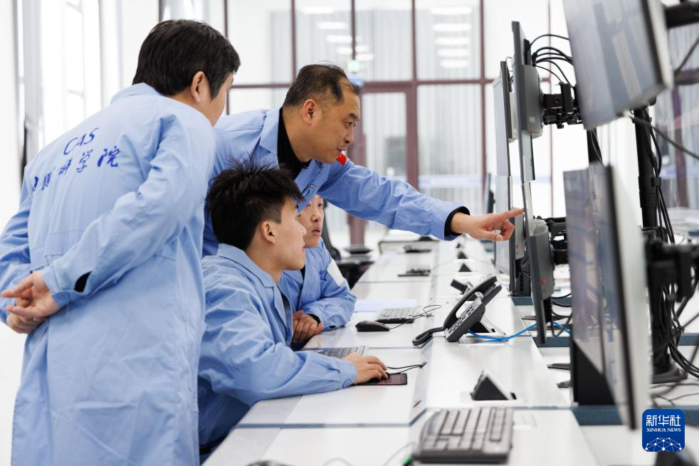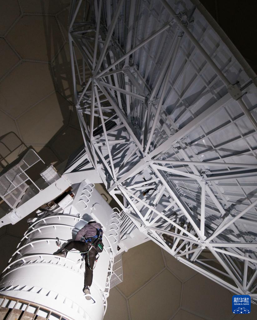 1月24日,工作人员李强(右)和田冬在卫星数据接收系统方位舱进行设备维护。