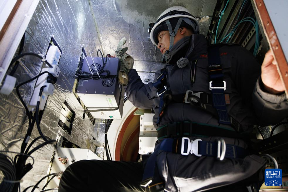 1月25日,站长施胜浦在天线的中心体里维护设备。