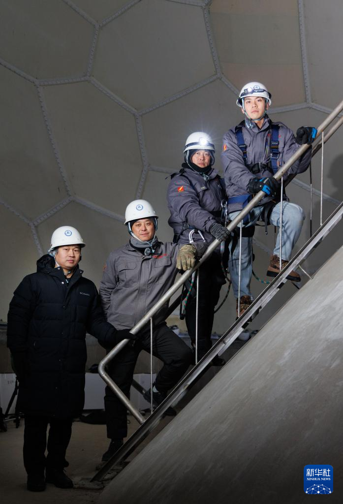 漠河站站长施胜浦(左二),工程师高景飞(左一)、李强(左三),助理工程师田冬在天线罩内合影(1月24日摄)。