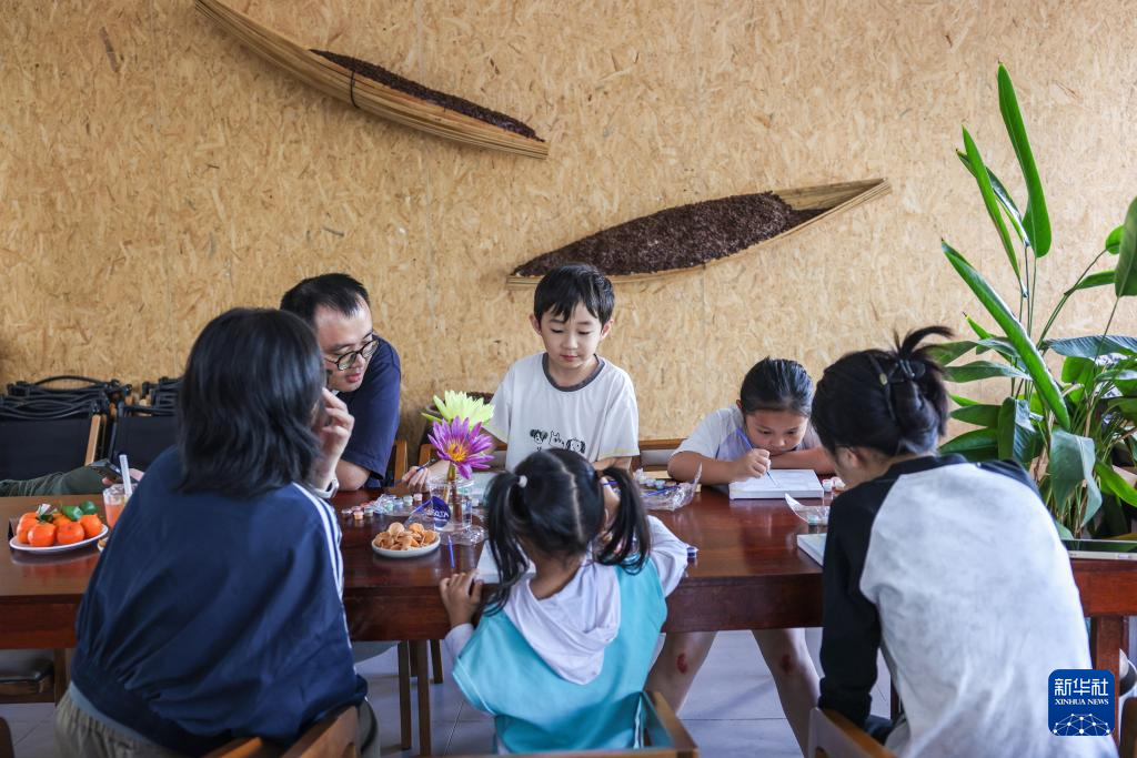 1月27日,小朋友在海南定安县富文镇的九所会客厅水塔咖啡馆里体验绘画课程。