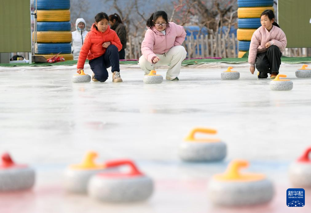 1月28日,在北京市平谷区镇罗营镇湖畔耕读园,小朋友们在活动现场体验冰壶。