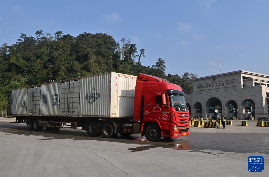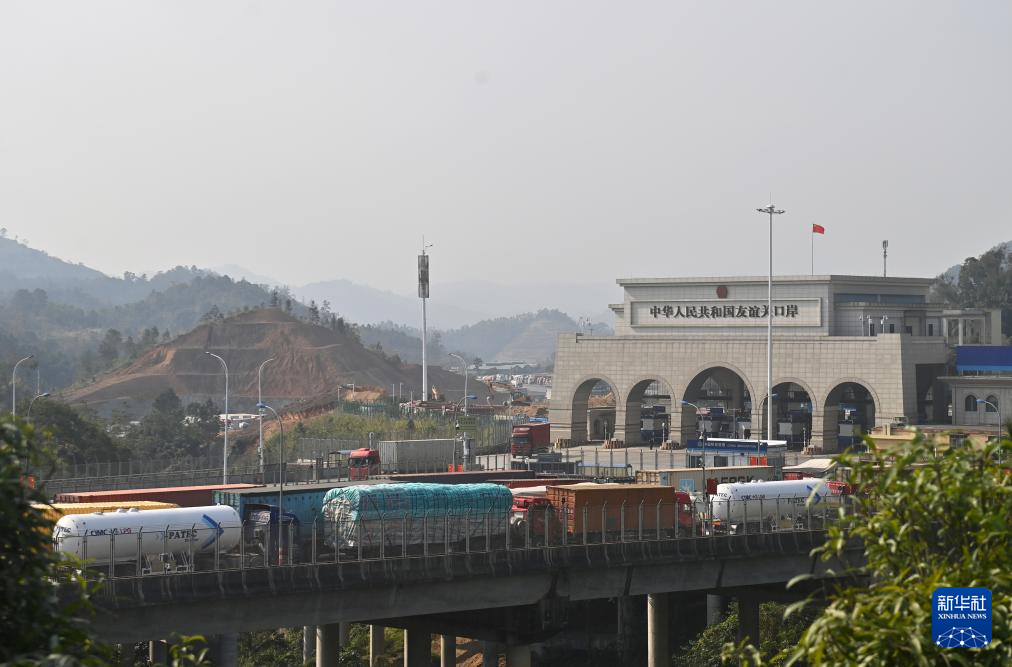1月28日,在位于广西凭祥的友谊关口岸,通关后的车辆准备驶往越南。