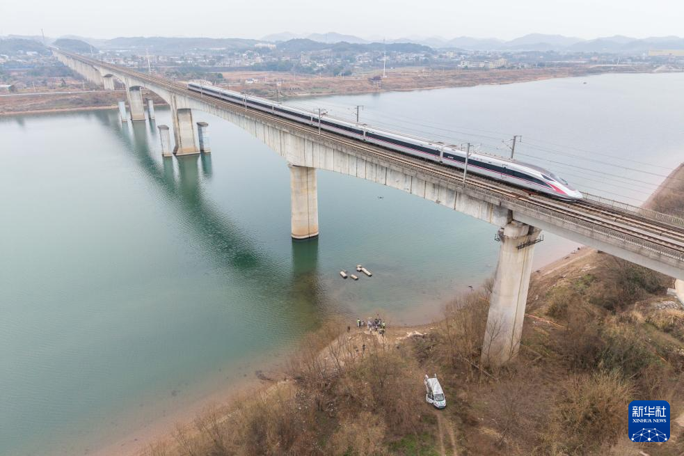 1月29日,一列高铁经过沪昆高铁湘江特大桥(无人机照片)。