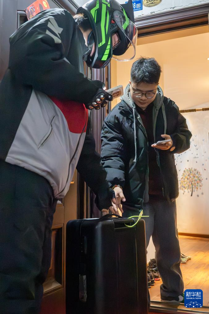 2月2日,在湖北武汉江岸区,程燚(右)从快递员手中领取行李。