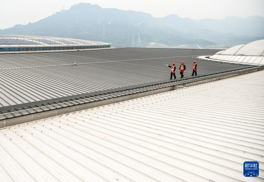 2月3日,蹇洲(左一)、胡渝平(中)、鲁奇在重庆东站站房屋顶进行巡检作业。