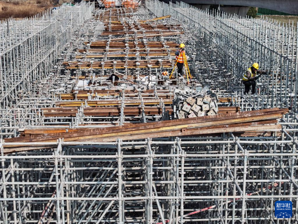 2月3日,中铁建城通公司工人在项目施工现场作业(无人机照片)。