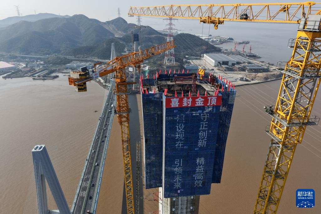 2月4日拍摄的甬舟铁路桃夭门公铁两用大桥6号主塔封顶施工现场,承台以上高度达198.1米(无人机照片)。