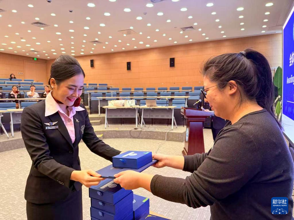 2月3日,泰国学员黄雅仪(左)在中国民航大学领取结业证书。
