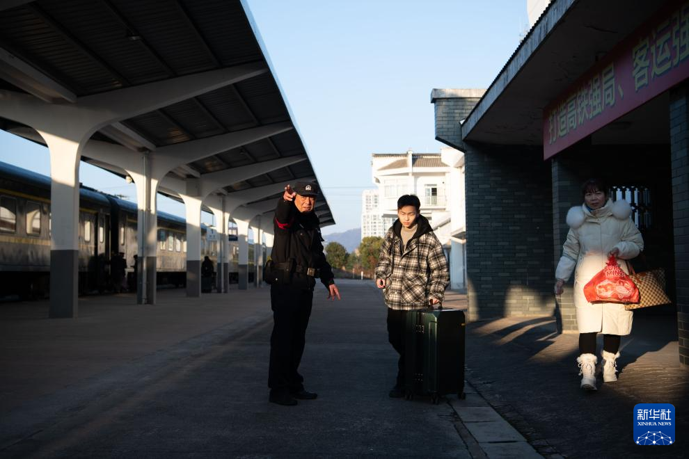 2月8日,在位于安徽省宣城市绩溪县的绩溪县站,汪七成(左)在引导旅客乘车。