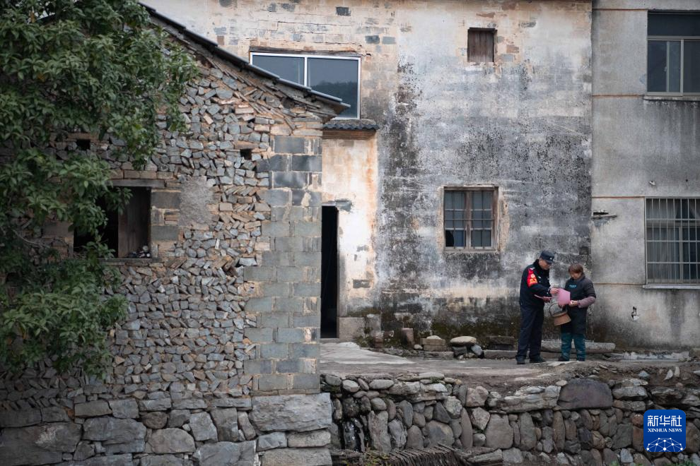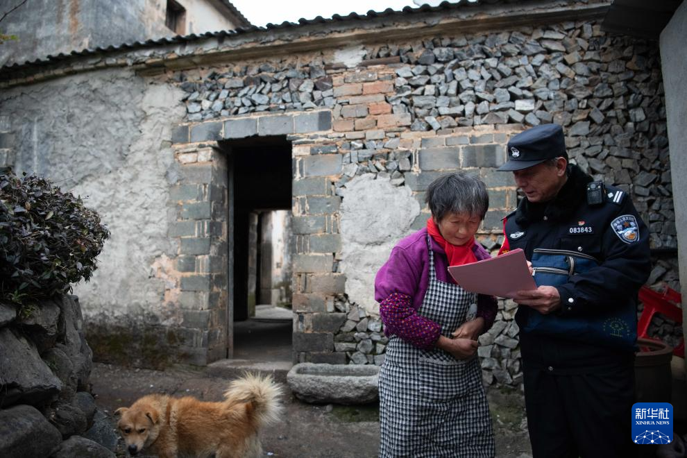2月7日,在安徽省宣城市绩溪县扬溪镇,汪七成(左)向沿线村民宣传铁路安全知识。