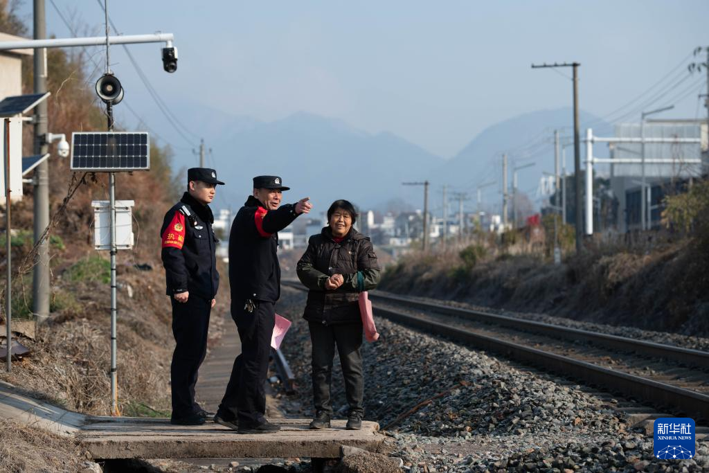 2月8日,在安徽省宣城市绩溪县,汪七成(中)向沿线居民宣传铁路安全知识。