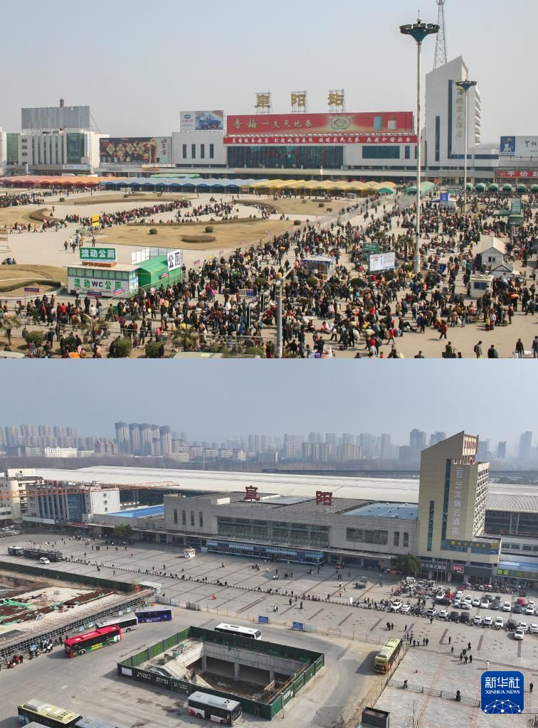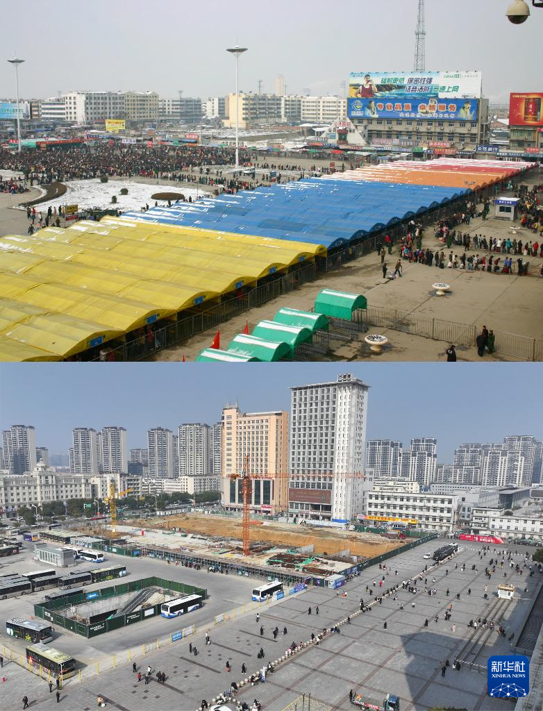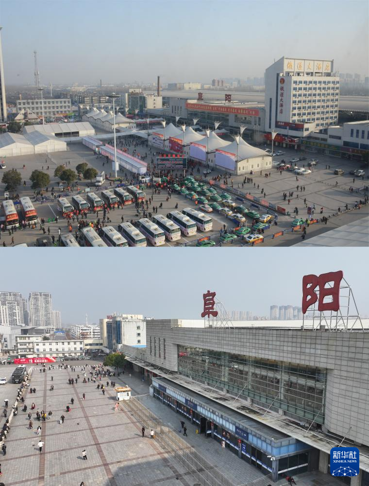 拼版照片:上图为2017年1月21日,春运期间的阜阳站站前广场(阜阳站党办供图);下图为2026年2月5日,春运期间的阜阳站站前广场(无人机照片,新华社记者 杜宇 摄)。