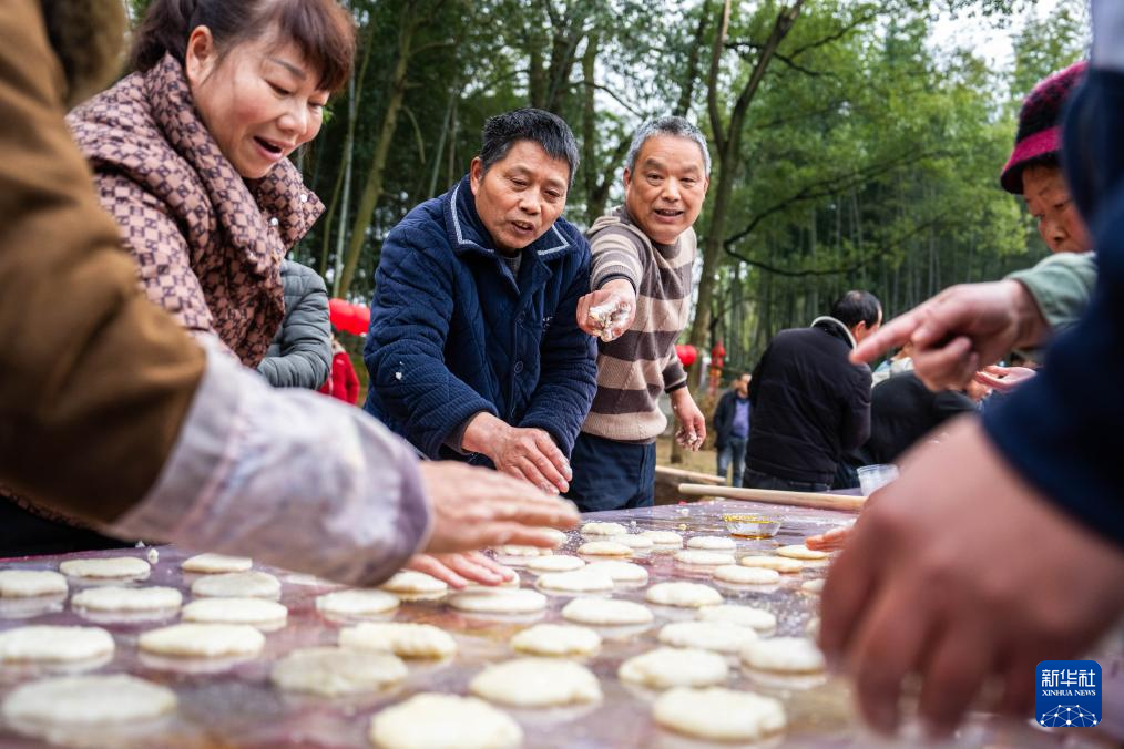 2月10日,村民在谢家铺镇港中坪村参与打糍粑大赛。
