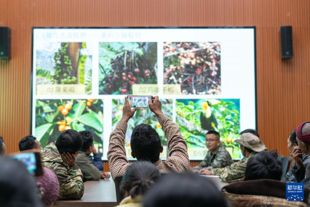 2月5日,盈江县太平镇石梯村村民在铜壁关省级自然保护区管护局组织的宣传活动上了解犀鸟食源植物知识。