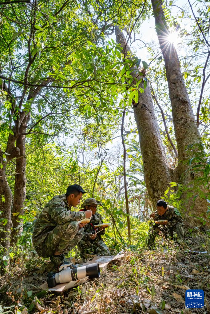 2月6日,“犀鸟巡护队”队员排忠华(左)、管能杰(中)与排新明在盈江县太平镇石梯村巡护期间记录犀鸟活动信息。