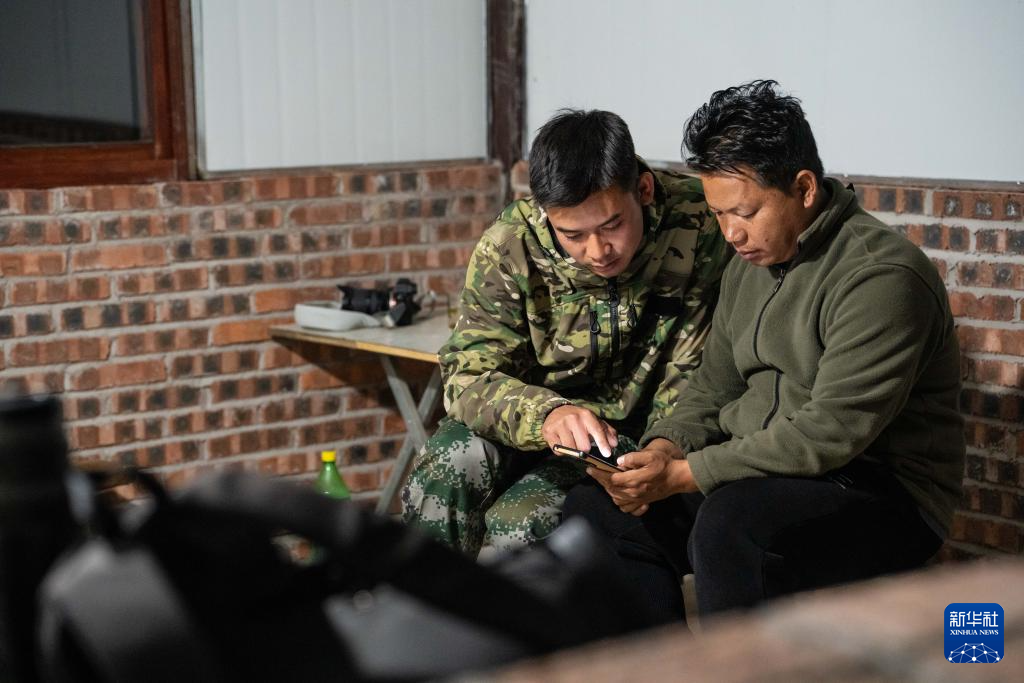 2月6日,“犀鸟巡护队”队员管能杰(左)与排忠华在盈江县太平镇石梯村一处犀鸟观测点记录犀鸟巢址。