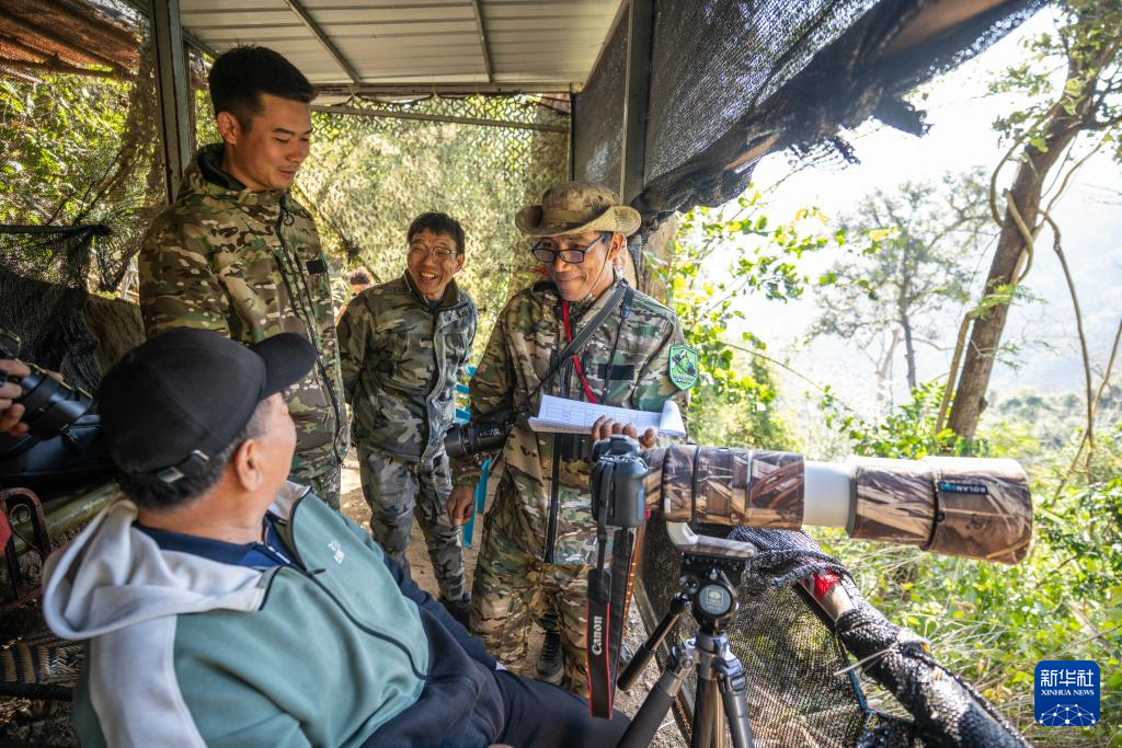 2月6日,“犀鸟巡护队”队员管能杰(中左)与排忠华(中右)在盈江县太平镇石梯村一处犀鸟观测点与游客交流。