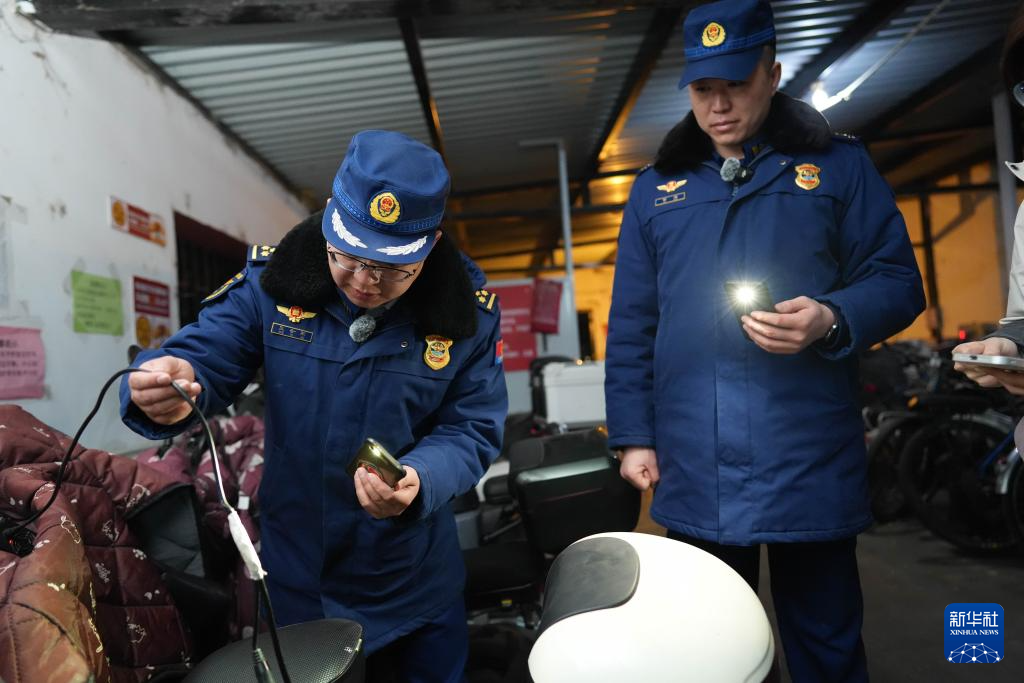 2月3日晚,海淀区消防救援支队双榆树消防站副站长王会军(左)和消防员贾超(右)在双榆树南里小区的电动车停车棚检查充电设备。