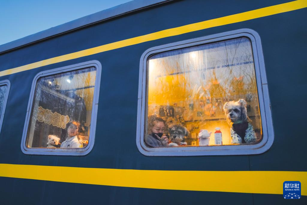 2月3日,在吉林省长春市一家火车车厢主题的宠物餐厅,几只宠物狗坐在窗边等待“宠物年夜饭”。