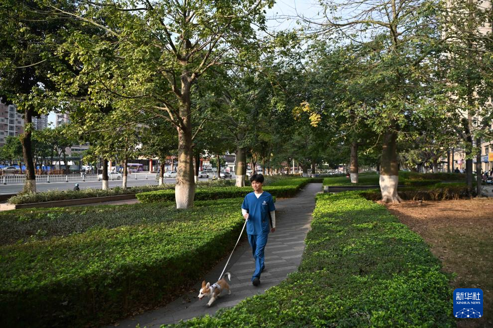 2月5日,在广州市荔湾区白鹤洞街道,飞猪宠物医院工作人员牵着寄养在此的宠物狗“屁屁”散步。飞猪宠物医院春节期间提供寄养服务,他们负责给寄养宠物喂食、清洁、代遛。