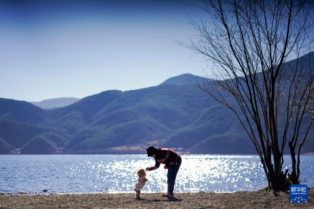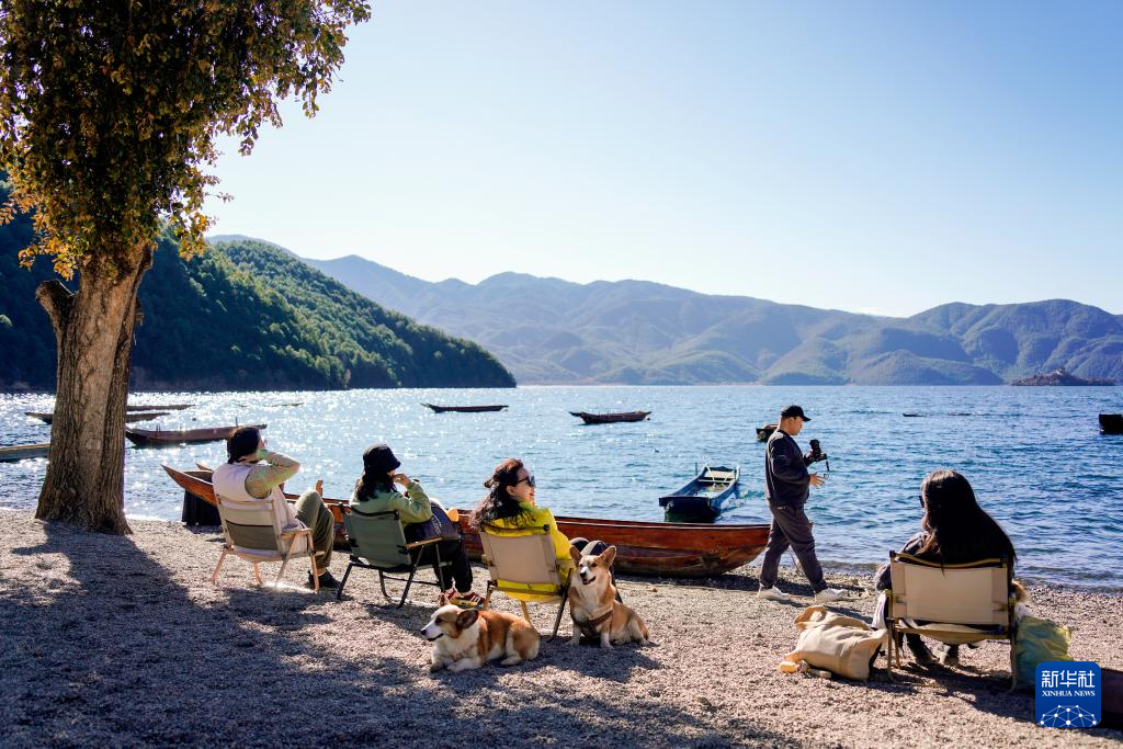 2月6日,游客与宠物在四川凉山泸沽湖景区游玩。