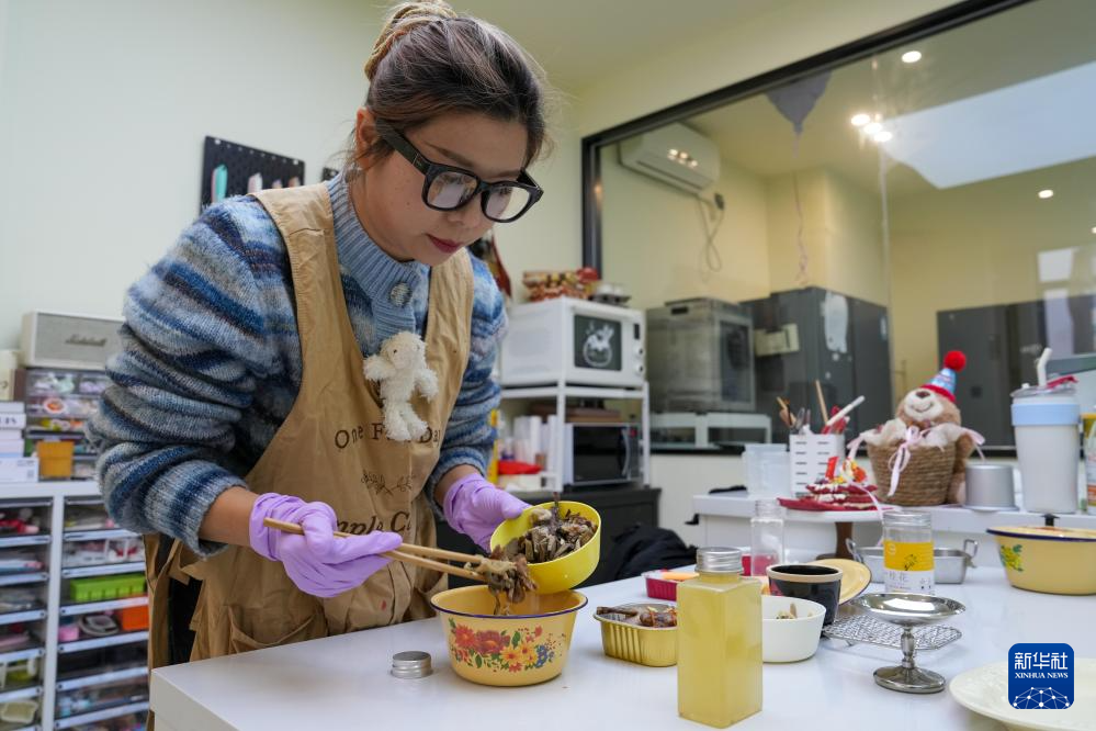 2月3日,在江苏无锡,宠物烘焙师丁一凡在制作宠物年夜饭的样品。