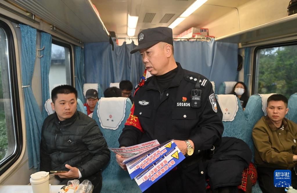 2月10日,黄庆明在T8701次列车上向旅客做反诈宣传。