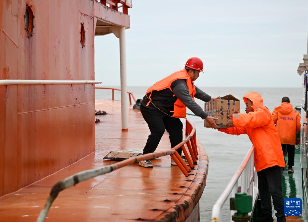2月10日,高级工程师王德旺(左)在船员的协助下往灯船上搬运检修设备。