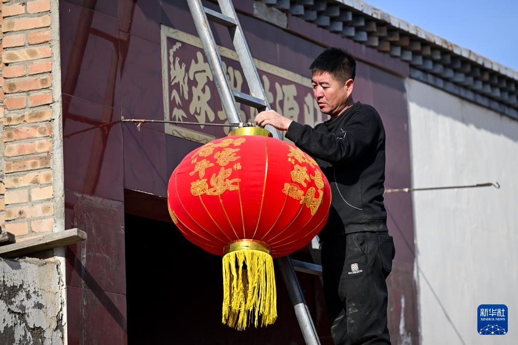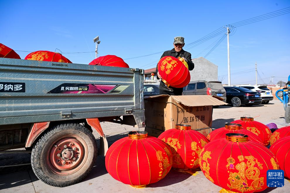 2月12日,村民在主根岱村组装灯笼,准备装饰村里道路。