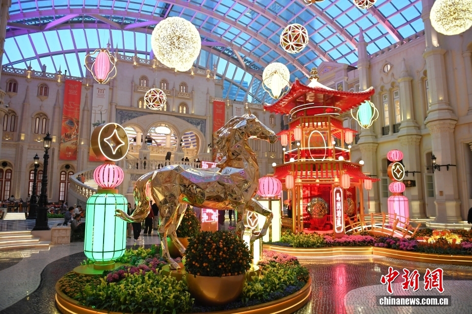2月13日,随着农历马年新春临近,澳门多地加装骏马主题装饰,市面氛围热闹喜庆,以骏马奔腾之姿迎接新春。图为澳门美高梅天幕广场的马年新春装饰。