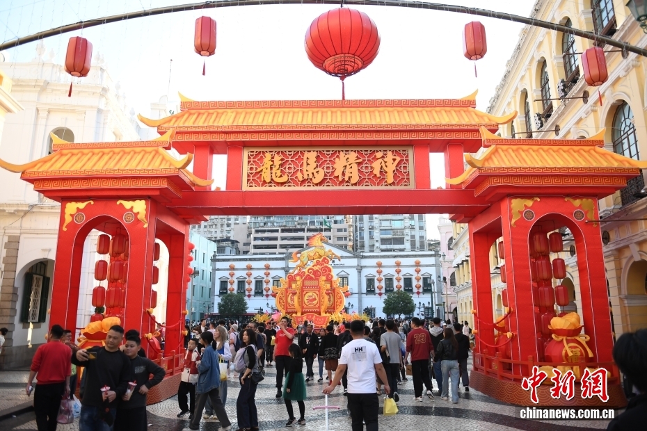 2月13日,随着农历马年新春临近,澳门多地加装骏马主题装饰,市面氛围热闹喜庆,以骏马奔腾之姿迎接新春。图为澳门大三巴牌坊前游人如织,一侧的花丛中加装了新春装饰。