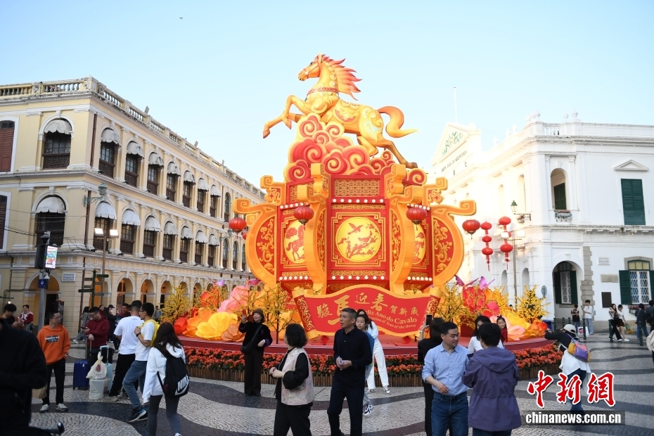 2月13日,随着农历马年新春临近,澳门多地加装骏马主题装饰,市面氛围热闹喜庆,以骏马奔腾之姿迎接新春。图为一些市民和游客在澳门议事亭前地广场,与骏马装饰合影留念。