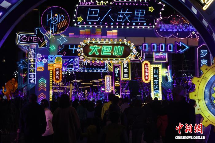 2月13日,2026四川达州首届新春彩灯游园会吸引游人。夜幕降临,五大主题区域近百组大型灯组次第点亮,游客在此共赴一场融汇千年文脉、现代科技与市井烟火的沉浸式新春文旅盛会。中新社记者 张浪 摄