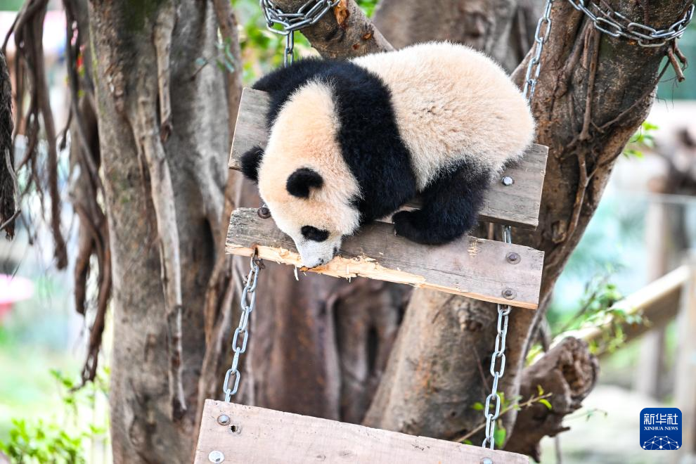 2月24日,大熊猫在户外玩耍。