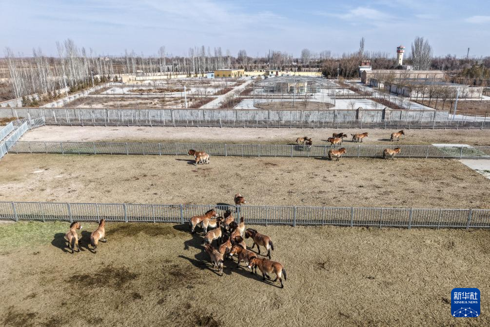 这是2月3日在甘肃濒危动物保护中心普氏野马饲养繁育基地拍摄的普氏野马(无人机照片)。