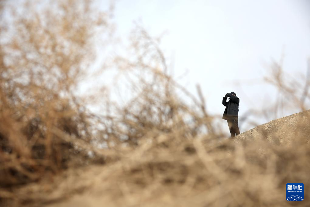 2月5日,甘肃敦煌西湖国家级自然保护区管护中心玉门关保护站工作人员孙海隆用望远镜查看普氏野马活动情况。