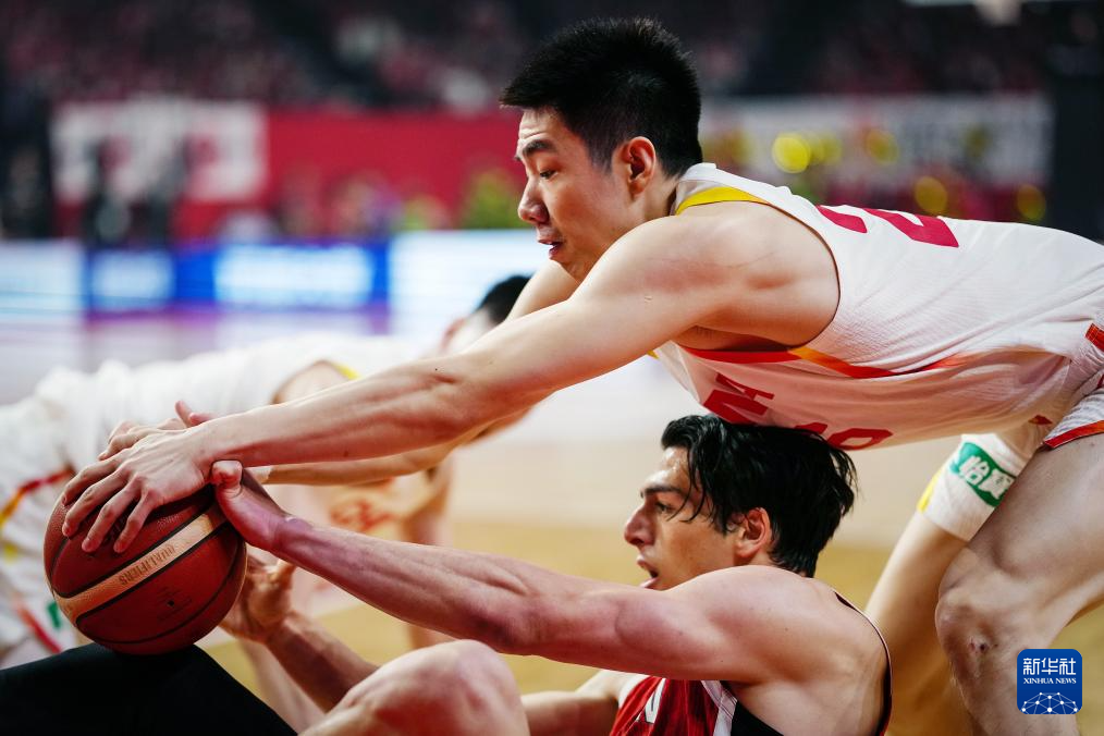 2月26日,中国队球员朱俊龙(上)在比赛中拼抢。